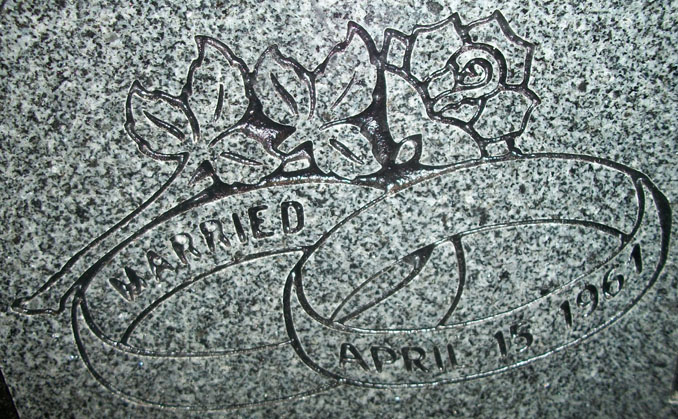 This companion memorial design features a pair of interlocked wedding bands with ample space for personalization (as shown here) such as a wedding date and then is further accentuated by the addition of a single rose. Shown here sandblasted on our high quality solid Gray Granite and then enhanced by the addition of a black lithichrome stone paint.