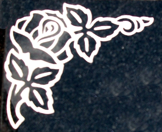 This beautiful rose in full bloom cemetery headstone design represents eternal love and is shown here sandblasted on to our high quality solid Jet Black Granite and then enhanced by the addition of a white lithichrome stone paint.