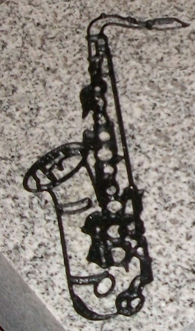 This engraved and highly detailed saxophone cemetery headstone design 1303 is shown here engraved on our high quality solid G614 Gray Granite and then enhanced by the addition of a black lithichrome stone paint.