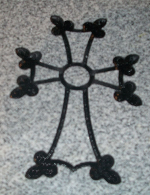 This unique scallop edged cross cemetery headstone design 559 is shown here completed on our high quality solid Gray granite and then enhanced by the addition of a black lithichrome stone paint. A great way to pay tribute to your devout loved one while adding a beautiful and unusual design.