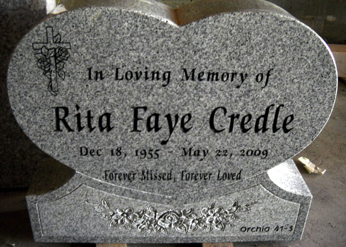 This unique heart shaped SH-01 model funeral monument is shown here in our high quality solid G614 gray granite and features our cross and rose design D-18 and the touching epitaphs of "Forever Missed, Forever Loved" and "In Loving Memory" all of which are enhanced by the addition of a black lithichrome stone paint.