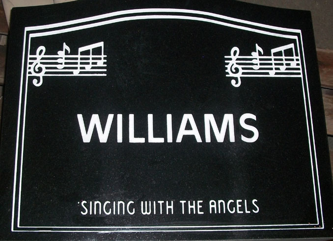 This musically themed cemetery headstone design 1259 features a serp top style double border epitaph box with a musical bar in each upper corner and the epitaph, "Singing with Angels" across the bottom. Shown here sandblasted on our high quality solid jet black granite and then enhanced by the addition of a white lithichrome stone paint.