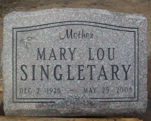 This enchanting slant headstone features two different fonts to emphasize the epitaph. The word mother is in a Murray Hill Bold font and the name and dates are sandblasted in a mon. modern roman style font. The monument also features a double outline around the epitaph and and a floral design to complete this elegant and feminine Memorial. We have over 1000 fonts and a wide variety of standard designs for engraving to choose from and we welcome designs of your creation. Click on the Link to see some of the standard designs we have available or contact us for more information and a price quote.