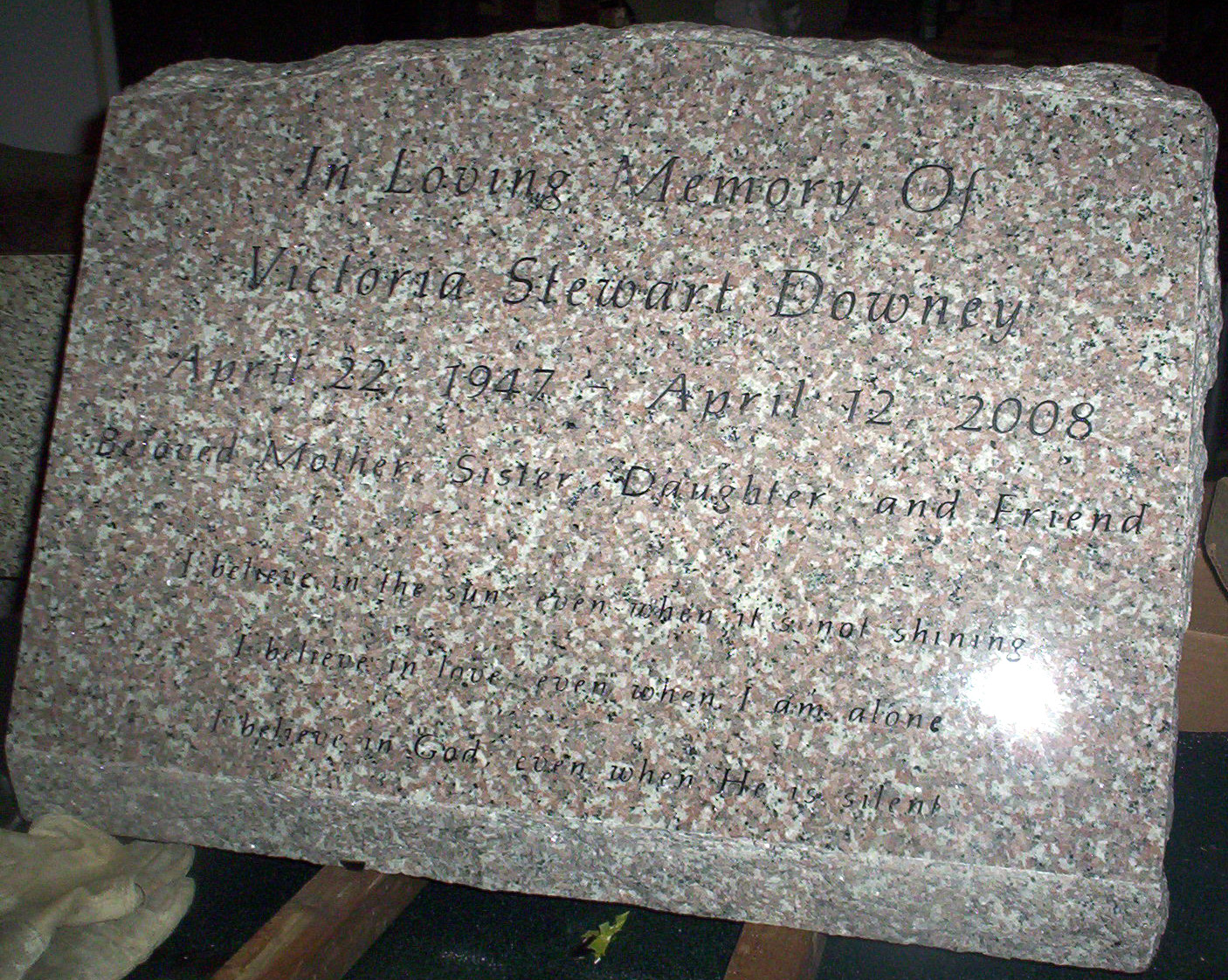 This elegant tombstone features a feminine Palatino Italic font accentuated by black lithichrome stone paint and an extraordinary epitaph. Click on the link to view some standard epitaphs or design your own. Contact us for more information on how to design the perfect memorial for your loved one and a free consultation.