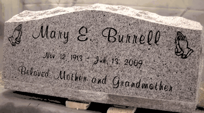 This stunning cemetery memorial is shown with two praying hands designs in each upper corner and an epitaph sandblasted into the murray hill bold font. We carry over 1000 standard designs and font styles. Click on the link to view the standard options or send us one of your own creations. Our goal is to help you create the perfect monument at a price you can afford.