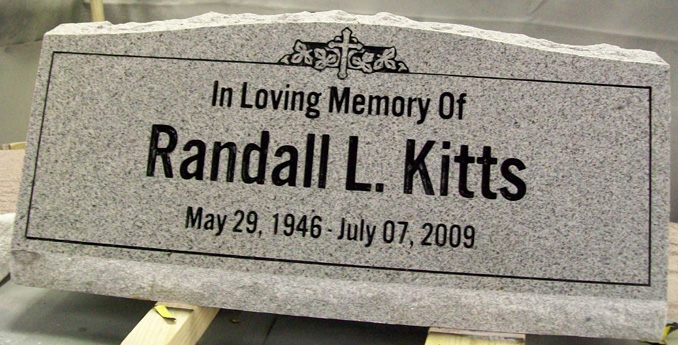 This solid granite slant style tombstone is shown here with our sandblasted floral-cross combination epitaph box design D-97 and the name, dates, and epitaph completed in an Alternate Gothic no. 3d font, all of which are highlighted by a black lithichrome stone paint.