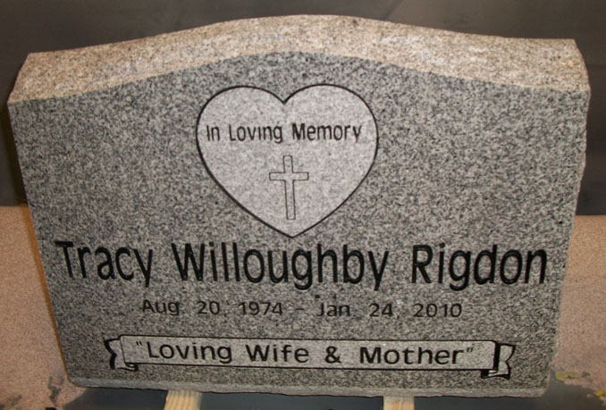This unique engraved Memorial in G633 Gray Granite with a combination our Heart Shaped Epitaph Box Headstone Design 1673, "In Loving Memory Epitaph, Basic Cross Design D-25, and Banner Style Epitaph Box Headstone Design 1641 with "Loving Wife and Mother" showcases the level of customization possible with our over 3000 designs and 1000 font styles. All of the designs and characters were sandblasted and then enhanced by the addition of a black lithichrome stone paint. (The inside of the heart shaped epitaph box was double processed which is an optional service available upon request that incurs additional charges).