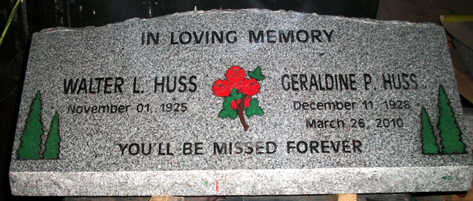 This beautiful custom engraved Slant style monument is shown here in use as a companion memorial and features the traditional names and dates along with the epitaphs "In Loving Memory", and "You'll Be Missed Forever" sandblasted and then highlighted by the addition of a black lithichrome stone paint. This custom slant also includes our rose bouquet design 1139, and a pair of our evergreen tree designs 306, which are enhanced by the addition of red, brown, and green lithichrome stone paint (which is an optional service available upon request but incurs additional charges).
