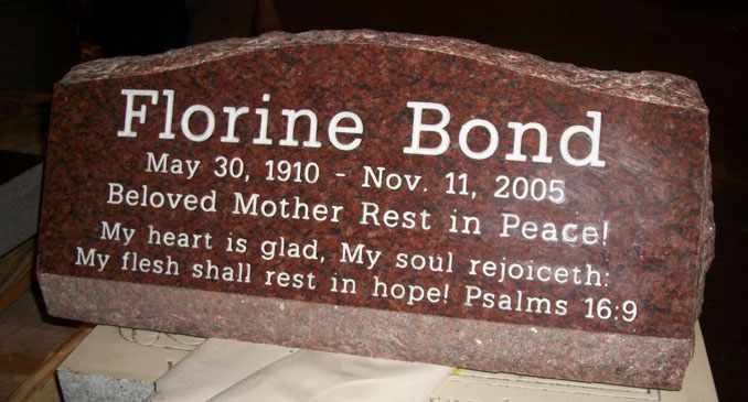 This memorial to a "Beloved Mother" features the traditional name and dates as well as the bible verse Psalm 16:9 which reads, "My Heart is glad , my soul rejoiceth, my flesh shall rest in hope" all of which is sandblasted in to our high quality solid India Red Granite and then enhanced by the addition of a white lithichrome stone paint.