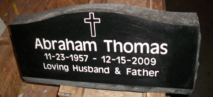 This high quality solid jet black SP7 model slant tombstone features our basic cross design D-25 along with the traditional name and dates as well as a custom epitaph that reads, "Loving Husband and Father" all of which have been sandblasted and then enhanced by the addition of a white lithichrome stone paint.