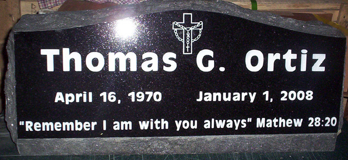 This tranquil jet black monument is shown with a cross and rosary sandblasted design along with a scriptural epitaph to highlight the devotion of your loved one to God. The bold font highlighted by a white lithichrome stone paint are the perfect combination to make this stone really stand out. We offer a wide variety sacred or religious designs and suggested scriptural epitaphs in our information page, or contact us with your own personal designs for a price quote.