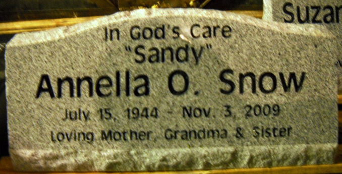 This slant style SP7 model funeral monument is shown here in our high quality solid G614 gray granite and features basic engraving, as well as the epitaphs "In God's Care" and "Loving Mother, Grandmother, and Sister" all of which are sandblasted and then enhanced by the addition of a black lithichrome stone paint.