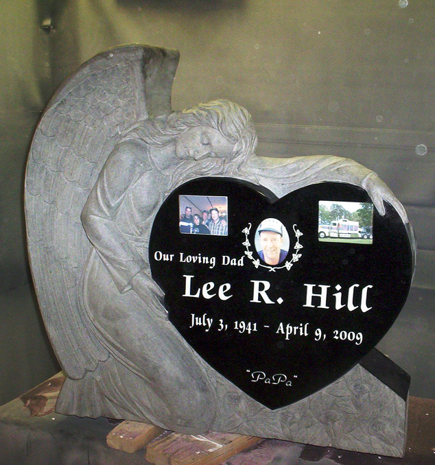This absolutely stunning TF-A02 model Angel and Heart Shaped memorial is shown here in our high quality solid jet black granite and completed by the addition of three ceramic photos, the basic name and dates as well as a floral design surrounding a ceramic photo and the custom epitaphs "PaPa" and "Our Loving Dad". The engraving is enhanced by the addition of a white lithichrome stone paint.