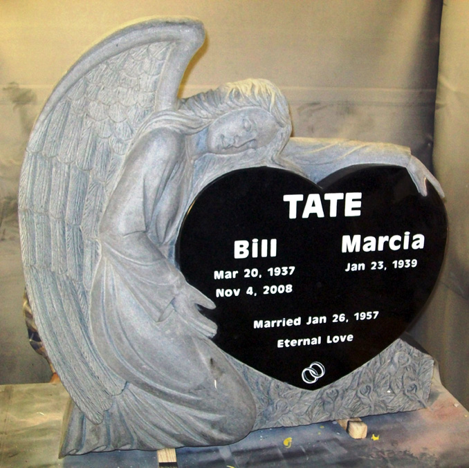 This beautiful TF-A03 solid high quality jet black TF-A02 model angel funeral memorial is shown here being used as a companion monument and includes the wedding dates, our D-87 wedding band design, basic engraving, and the touching epitaph "Eternal Love" all enhanced by the addition of a white lithichrome stone paint.