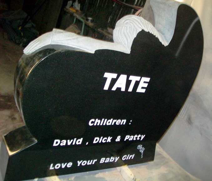 The back view of this TF-A02 jet black funeral memorial demonstrates the versatility of the monument in that it has plenty of room for customization as shown here with a surname, the names of the children, our simple but elegant single rose cemetery headstone design D-80, and the touching epitaph "Love Your Baby Girl" all enhanced by the addition of a white lithichrome stone paint.