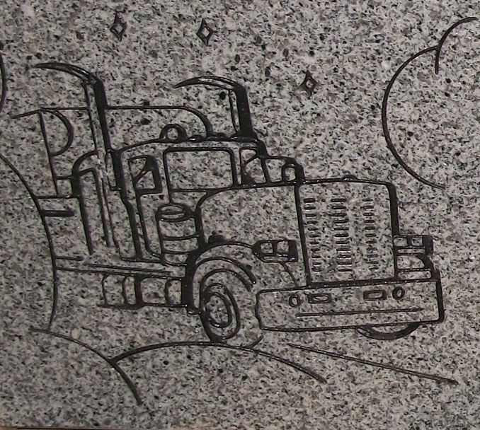 This highly detailed cemetery headstone design 1611 features a semi-truck driving in Heaven surrounded by clouds and stars. Shown here engraved on our high quality solid gray granite and then enhanced by the addition of a black lithichrome stone paint, this would be an excellent way to pay tribute to your favorite truck driver.