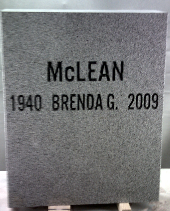 This commanding monument is impressive in its simplicity. It is 36x14x8 and features a solid granite vase attached to the base. The basic epitaph is shown in an alternate gothic no3d font highlighted by a black lithichrome stone paint. A great addition to this headstone would be a ceramic photo to show the world how you want your loved one to be remembered or a sandblasted floral design. Click on the links to view our selection on these items or contact us with any questions.