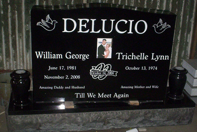 This absolutely stunning Monument showcases perfectly just how personalized and custom you can get with one of our memorials. This stone is polished on the back and front so there is plenty of room for epitaphs and the two solid granite vases are excellent features for this companion headstone. This particular marker is shown with two sandblasted designs, the wedding band and the doves. We offer a wide selection of standard designs and we always welcome original designs of your creation so click on the link or contact us for more information. The touching epitaphs of "Till we Meet Again", "Amazing Daddy and Husband", and "Amazing Mommy and Wife" along with the other characters are completed in a worcester round t reg font and highlighted with a white lithichrome stone paint. The ceramic wedding photo is a touching way to show the world how you want your loved one remembered and we offer a wide variety of shapes and sizes to fit your needs. Click on the link or contact us for more information on how to create the perfect memorial for your loved one.