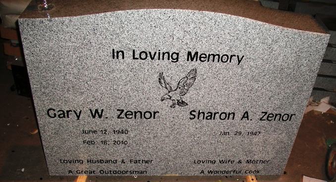 This U1 model upright memorial monument is shown here in our high quality solid G614 granite in use as a companion headstone and features the traditional two name and dates as well as the epitaph, "In Loving Memory" and the tributes of "Loving Husband and Father", "Loving Wife and Mother", "A Great Outdoorsman", and "A Great Cook" as well as our majestic Eagle in Flight Design 226 all sandblasted and then enhanced by the addition of a black lithichrome stone paint.