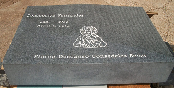 This beautiful companion monument is designed for use with two name and dates and features a custom epitaph in Spanish as well as our intricately detailed Sacred Heart of Jesus headstone design 1470 shown here sandblasted into the G654 Dark Gray Granite and then enhanced by the addition of a white lithichrome stone paint.