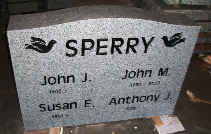This engraved U-1 upright monument is so versatile that it can be used for an individual, as a companion marker, or even as a family memorial as shown here with sandblasted with the surname in large bold characters set between a pair of custom dove designs followed by four individual name and dates all enhanced by the addition of a black lithichrome stone paint (also available in white).