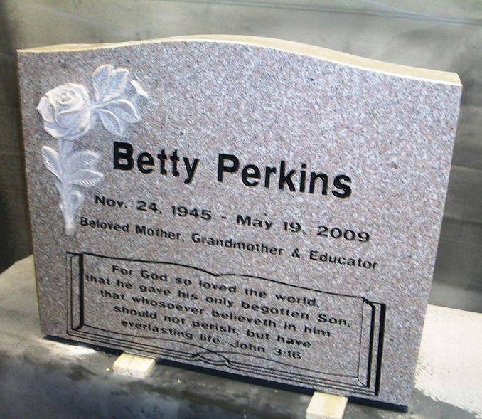 This beautiful U2 model memorial features and out carved flower on the left hand side with plenty of room for customization in the center as shown here sandblasted with the traditional name and dates as well as an open bible epitaph box with the full John 3:16 bible verse and the tribute of "Beloved Mother, Grandmother, and Educator" all enhanced by the addition of a black lithichrome stone paint.
