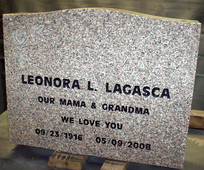 This dazzling and feminine tombstone is 30x24x6 inches in size and features a stenciled flower design in the upper left hand corner to add character and a feminine touch. As shown, this monument is perfect for that special woman who touched your life. The loving epitaph to a "Mama" and "Grandma" celebrates the life of someone much loved in an antique olive bold font.
