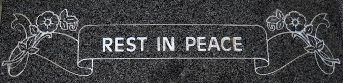 This engraved beautiful and flowing Victorian Rose and Ribbon style banner funeral memorial motif 3043 is shown here duplicated and reversed so that the ribbon connects and forms a drape style design to adorn the top of this high quality solid G654 Dark Grey granite monument and is enhanced further by the addition of a white lithichrome stone paint as well as the addition of the phrase, "Rest in Peace". With our over 2000 design options the possibilities for customization are essentially limitless so contact us today and let us help you create the perfect tribute to your loved one.