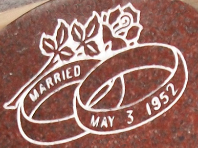 This intricately designed cemetery headstone design 1066 features a pair of interlocking wedding bands with room for customization such as a wedding date or brief epitaph adorned on the top by a beautiful and classic single long-stemmed rose. Shown here sandblasted into our high quality solid India Red Granite and then enhanced by the addition of a white lithichrome stone paint.