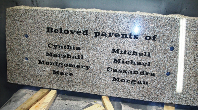 This image of the engraved X-01 shows the polished top of the base that would rest on the ground and under the actual bench itself. With the polished top this surface provides additional room for engraving as demonstrated here with the "Beloved Parents Of" and the list of children's names all sandblasted and then highlighted by the addition of a black lithichrome stone paint.