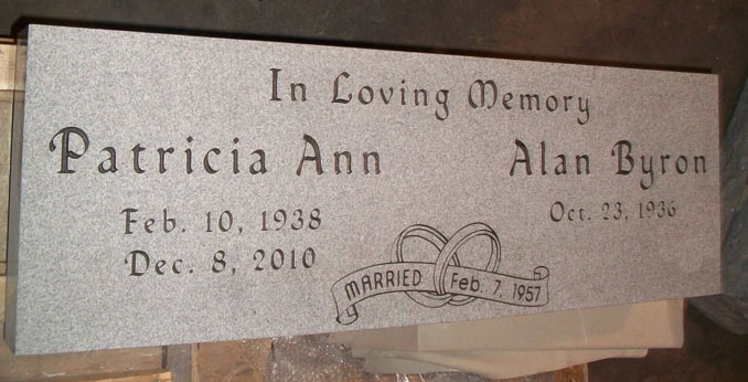 This tribute is designed as a companion monument with two individual names and dates, the epitaph "In Loving Memory", and the rings and ribbon companion headstone design 1699 with a pair of wedding bands and a ribbon style banner with room for a brief epitaph or wedding dates as shown here engraved on our high quality solid G633 Gray Granite and then enhanced by the addition of a black lithichrome stone paint.