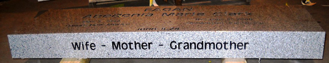 This side view of the X-01 G633 gray granite memorial bench really demonstrates the level of customization that can be completed on this versatile monument as the five polished side provide ample room for various levels of personalization and multiple epitaphs as shown here with the titles of "Wife", "Mother", "Grandmother" sandblasted and enhanced by the addition of a black lithichrome stone paint.