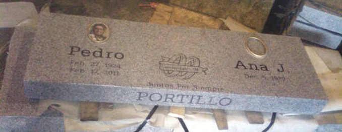 This high quality solid G633 Gray Granite Memorial Bench is designed as a companion monument with two name and dates as well as our rings and ribbon cemetery headstone design D-63, a custom Spanish epitaph,and a pair of our bronze frame ceramic photos (just one of our many sizes and styles).