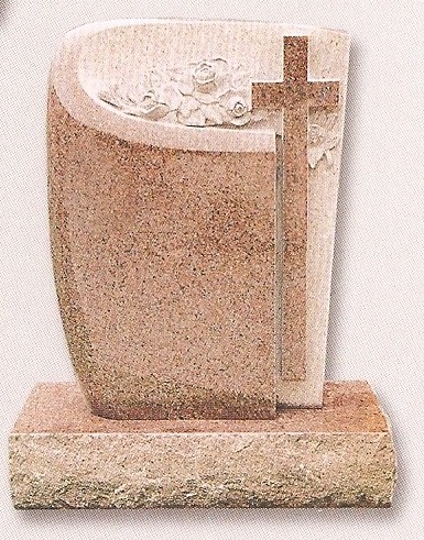 China pink granite gravestone memorial with carved cross and floral design. Priced with a base size of 32x14x8.
