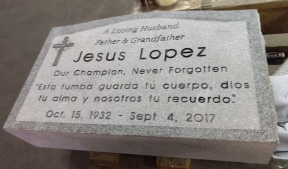 This cemetery grave stone features a polished border around the stone with the inside double processed. The lettering was sandblasted and filled with black litho paint. Free proof and quote by emailing us at chris@headstonesusa.com