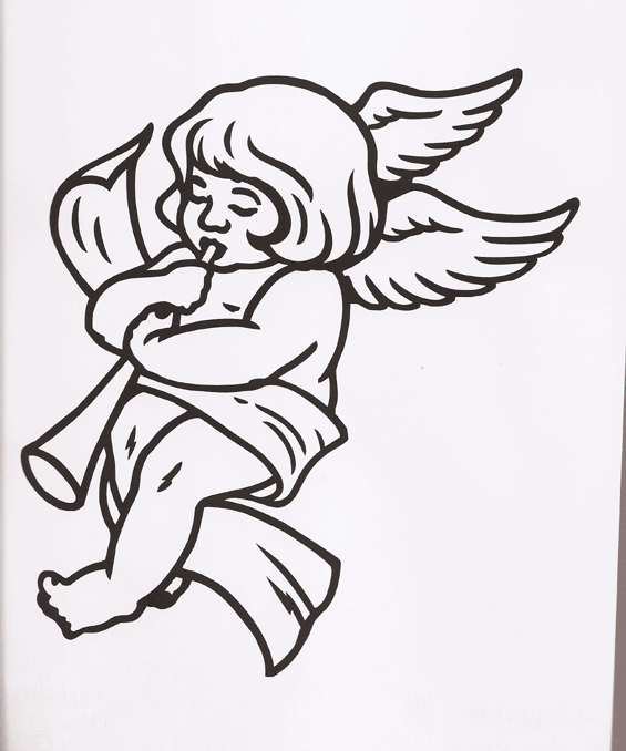 This cemetery marker design features a cherub style angel adorned with ribbons playing a trumpet .