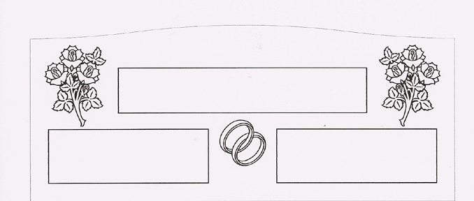 This cemetery headstone design is specifically created for use on companion monuments. It features a large basic epitaph box perfect for use with a surname adorned on each side by a rose bouquet and then followed by two individual epitaph boxes and a pair of wedding bands. Shown here engraved into our high quality Anxi granite and then highlighted by the addition of a black lithichrome stone paint this design is the perfect way to show your loved one's love and devotion to each other. |  Engraved Companion Memorial Design 1813 This is one of our unique companion memorial designs. The pictured design features a surname border, two epitaph borders, two bouquets of roses, and a set of interlocked wedding bands. The design seen here has been engraved onto one of our solid gray granite upright memorial models. Email us today to add this design to your memorial. |
