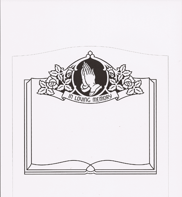 Sandblasted Religious Headstone Design This upright gravestone features design 2019 that was sandblasted and highlighted with black litho paint. This gravestone design features an open bible and a praying hands design at the top center. Customize your loved one's memorial by adding this religious memorial design. Call for details at 314-807-6910 |