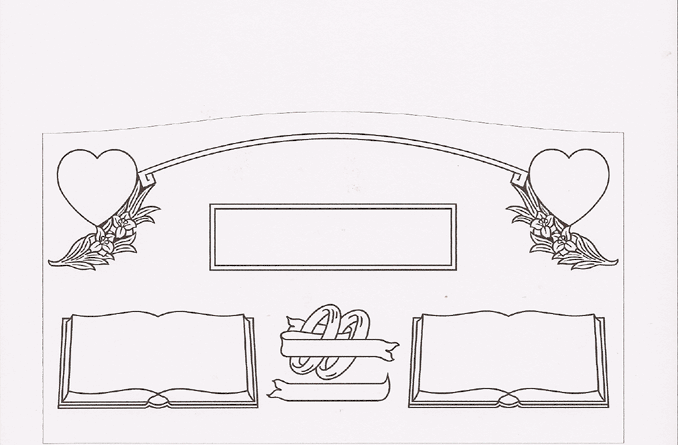 This religiously themed companion cemetery memorial motif features symbols of pure love, peace, devotion, and a union blessed by God. The top of the monument is adorned by two hearts adorned by bouquets of lilies and a double border epitaph box in the lower half of the design there is a pair of wedding rings with two ribbon style banners set between two individual open bible epitaph boxes. If you are looking for a companion design to illustrate the godly life that your loved ones lived together, then this is the design for you.
