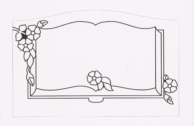 This cemetery memorial motif features an open book style border box adorned on the upper left hand corner the lower center and the lower right hand corner by a wild flower. A simple but charming design that is versatile enough to be used for a single or companion monument. A quote that could be paired easily with this motif is by Marceline Desbordes-Valmore and says, "Are we not like two volumes of one book?"