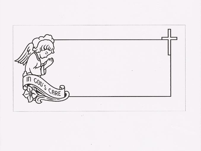 Angel Design Featured is the angel design. This design shows an angel that symbolizes love for Jesus Christ our Savior. This angel also symbolizes peace for your loved one. |  Engraved Angel Border Design The pictured design includes a kneeling angel with a banner that reads, " In God's Care." From this design is a single line border with a cross in the upper right corner. The design seen here has been engraved onto one of our gray granite markers. |