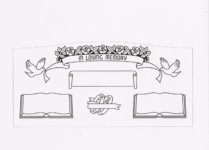 This complete memorial design with a pair of doves holding a banner that reads, "In Loving Memory" followed by a scroll style epitaph box with a surname and a pair of open bible epitaph boxes with an interlocking pair of wedding rings resting between them. Shown here sandblasted into our jet black granite and then enhanced by the addition of a white lithichrome stone paint. |  Wedding Design 2018 Featured is a lovely companion memorial design. It was sandblasted and filled with black litho paint. This gravestone design features a banner for the surname, open bibles for names and dates along with birds holding a ribbon with roses on top. Email us today for a free proof and quote. |