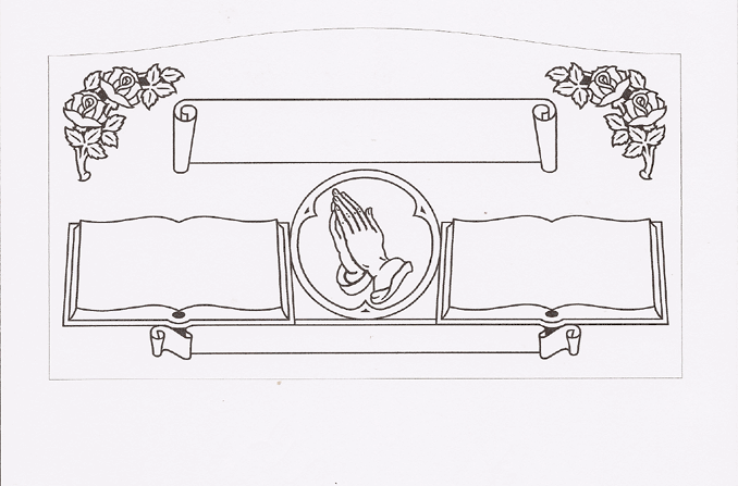 This religious companion cemetery memorial motif features a beautiful pair of roses in each upper corner that frame a scroll style banner perfect for use with a surname or a favorite quote followed by a cameo style pair of hands folded in prayer resting between two open bible style epitaph boxes and a ribbon style banner. This versatile design provides plenty of room for customization and can be paired excellently with the Bible verse found in Romans 12:12 that says, "Be joyful in hope, patient in affliction, faithful in prayer".