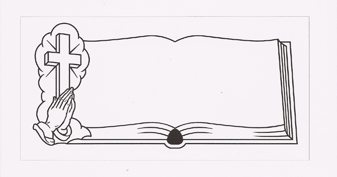 This religious cemetery memorial motif features an open bible style border box with plenty of room for customization and is adorned on the left hand side by a three dimensional cross surrounded by rays of light and a cloud followed by a pair of praying hands. A design that illustrates the song by Isaac Watts , "At the Cross" that says "At the Cross, At the Cross where I first saw the light, And the burden of my heart rolled away, It was there by faith I received my sight, And now I am happy all the day".