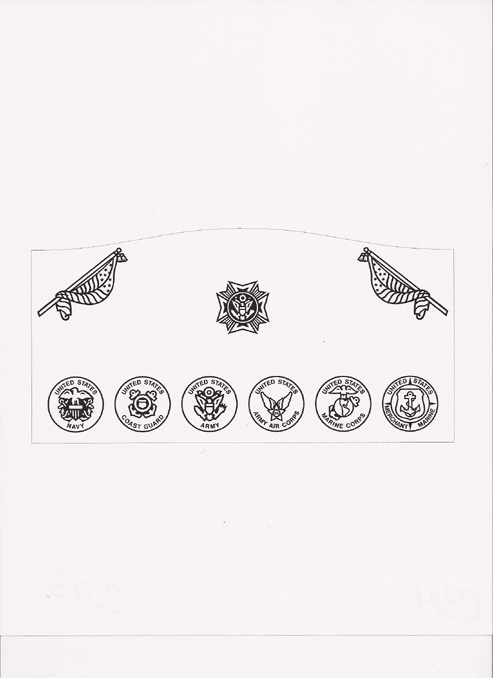 This complete cemetery monument motif features an American flag in each corner and an array of military insignias. This is a great choice for use as a military memorial and would be paired great with the quote by Benjamin Disraeli that says, "The legacy of heroes is the memory of a great name and the inheritance of a great example".