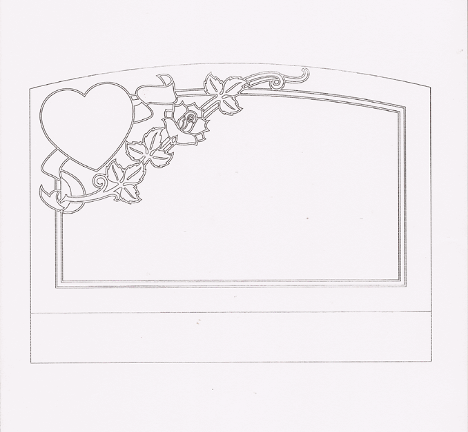 This loving cemetery memorial motif features a double rounded top border box enhanced in the upper left hand corner by a heart with room for a brief epitaph encircled by a ribbon and adorned at the bottom by a single long stemmed rose. This design can be used as a companion motif or simply to honor the love you shared. A great quote that could be paired with this design is by Edgar Allen Poe and says, "We loved with a love that was more than love".