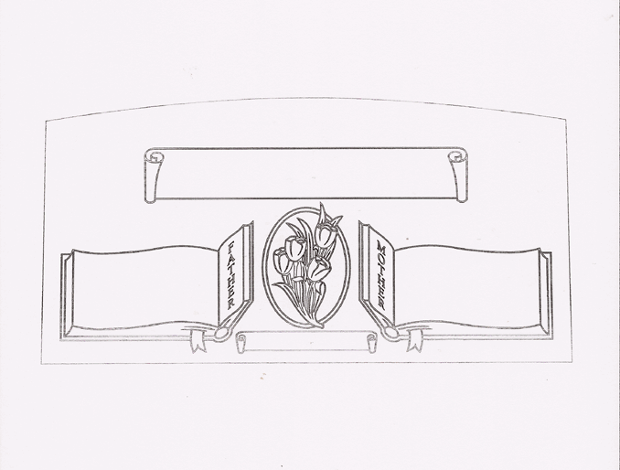 This companion cemetery memorial motif is adorned on the top by a scroll style banner with plenty of room for a surname or other brief epitaph followed by two open book epitaph boxes complete with individual pages and a bookmark. The box on the left provides room for individual information on the left and reads "Father" on the right. The box on the right provides room for personalization on the right and reads "Mother" on the left. Set in between the two open book epitaph boxes is a beautiful cameo style tulip bouquet that add both beauty and grace in addition to being the symbol of a perfect love. The overall design is completed by the addition of another small scroll style epitaph box at the bottom that would be perfect for a wedding date or brief epitaph.