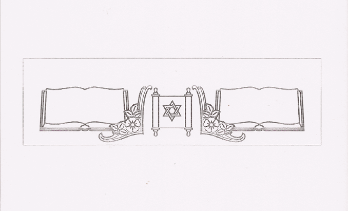 This Jewish style cemetery memorial motif features an Old Testament style ancient scroll with a Star of David in the center adorned on each side by a corner bracket style wild rose motif and an open bible style epitaph box.