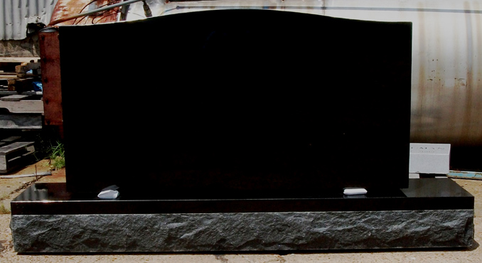 This magnificent high quality solid jet black granite upright memorial features a top that has a polished five finish. The top measures 54 inches left to right, 28 inches top to bottom, and is 8 inches thick. The base (as shown) is included and features a polished top and margin with rough cut front, back and sides. The base measures 72 inches left to right, 14 inches wide, and 8 inches high.