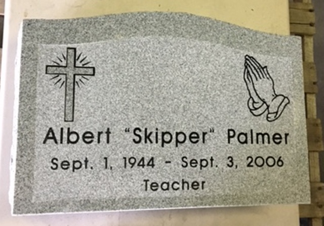 This upright headstone features a cross and praying hands design along with lettering that was sandblasted. All engraving is enclosed within a double processed box. Email us to customize a gravestone for your loved one today at chris@headstonesusa.com